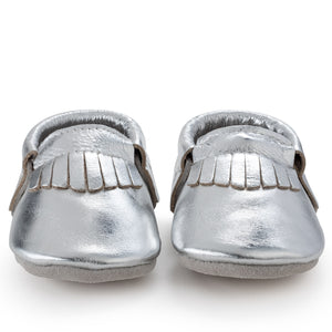 Our amazing Silver moccasins are perfect for whenever your baby needs just a little extra shine! All children look precious in this mocc.
