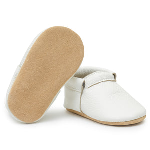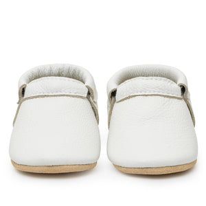 Our brand new Seashell Fringeless Moccs combine a Classic Pearl White with a suede sole.