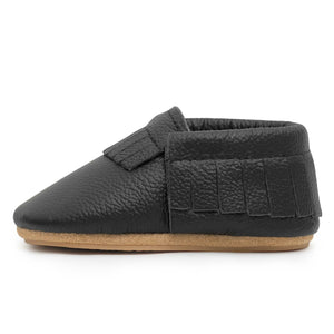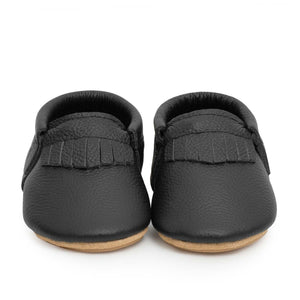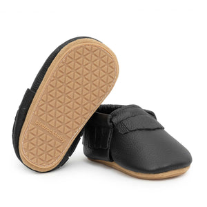 Black moccasins are a super stylish option that go with everything and look good everywhere. Now available with a hard sole for little walkers.
