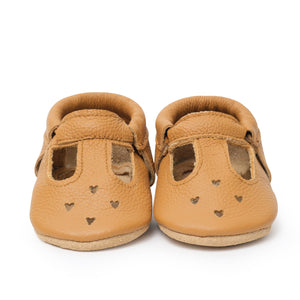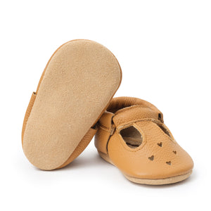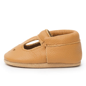 New! Our Gingersnap Mary Jane is a beautiful tan that can be dressed up or down. The suede bottom adds a touch of traction for your little one.