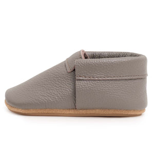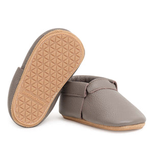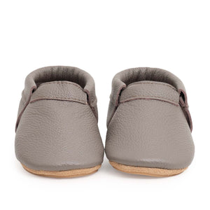 Slate is one of our most popular colors and looks incredible in Fringeless! This mocc's earth tones match everything. Now available with a hard sole for little walkers.
