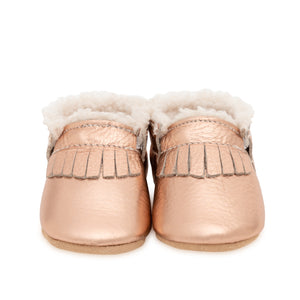 Introducing the Rose Gold Sherpa moccs! This cute color is perfect for adding a touch of elegance to any outfit, while the soft sherpa lining will keep your little one’s feet warm and cozy. The moccasins are easy to put on and take off, making them the perfect addition to any winter wardrobe.